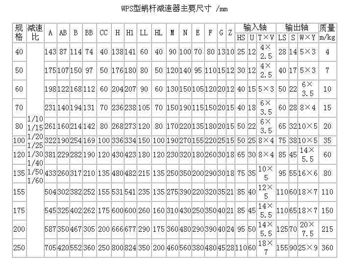 WPS40、WPS50、WPS60、WPS70、WPS80、WPS100、WPS120、WPS135、WPS155、WPS175、WPS200、WPS250型蝸輪蝸桿減速器
