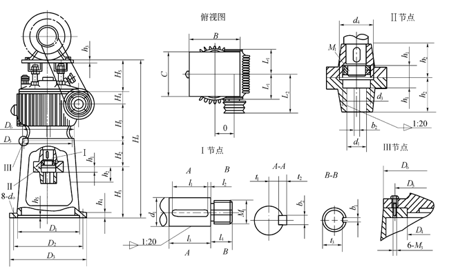 M型立式蝸桿減速器為二級(jí)減速傳動(dòng),第一級(jí)為皮帶傳動(dòng),第二級(jí)為阿基米德蝸桿傳動(dòng)。結(jié)構(gòu)緊湊,傳動(dòng)比大,工作平穩(wěn)可靠、噪聲低,具有自鎖性。